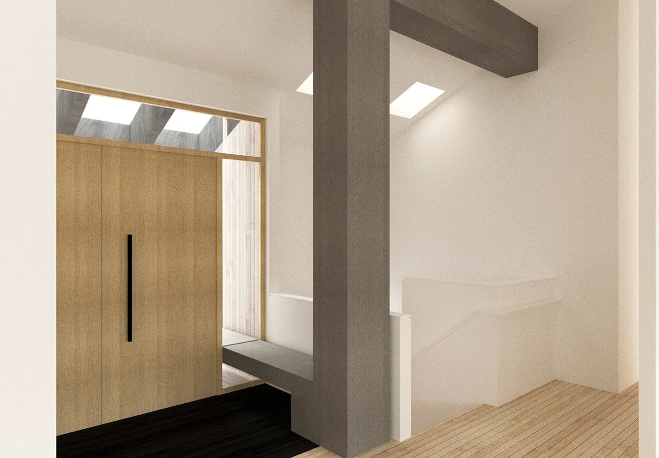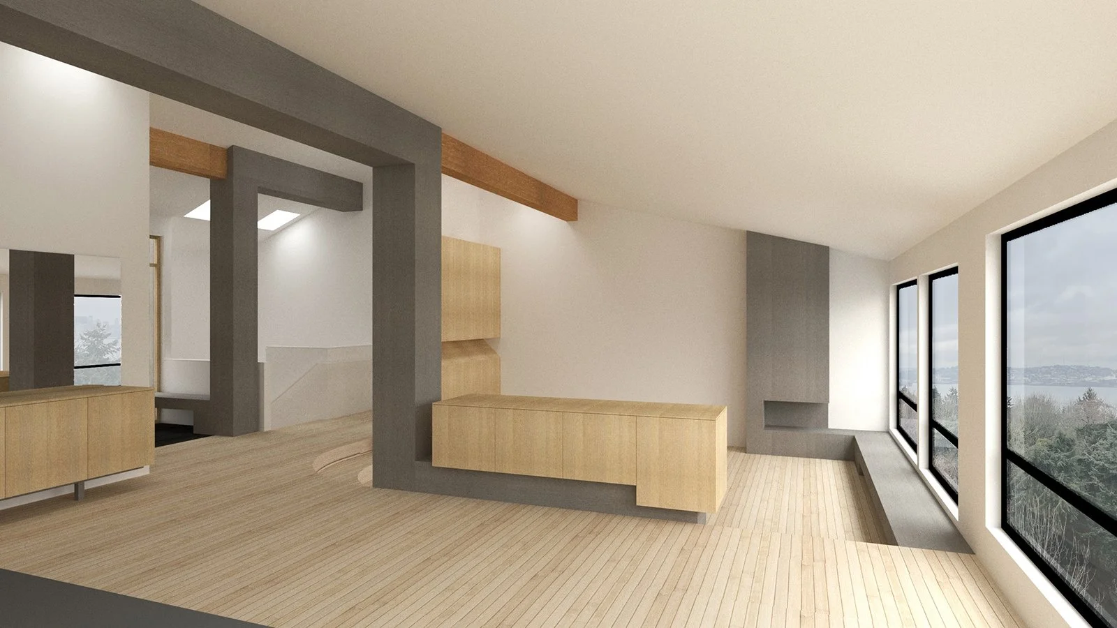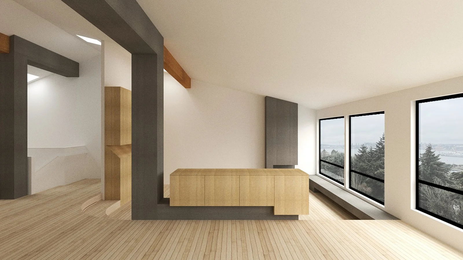 For this remodel project to an existing 1970s West Seattle Residence, a structural beam reinforcement is used as a means to unify the living, dining, and kitchen spaces. Inspired by artist Sol LeWitt’s ‘Incomplete Open Cubes’, a series of three ‘bent’ casework frames are carefully placed throughout the existing space. Each serves a specific purpose: 1) to conceal the beam reinforcement; 2) to contain a new living room fireplace and chimney; and 3) to serve as an indoor/outdoor bench at the entryway.